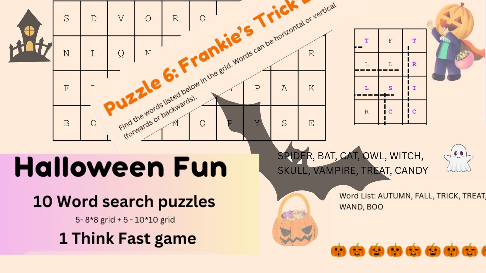 Halloween party 10 word search puzzles for children and 1 poster & 1 ThinkFast Game